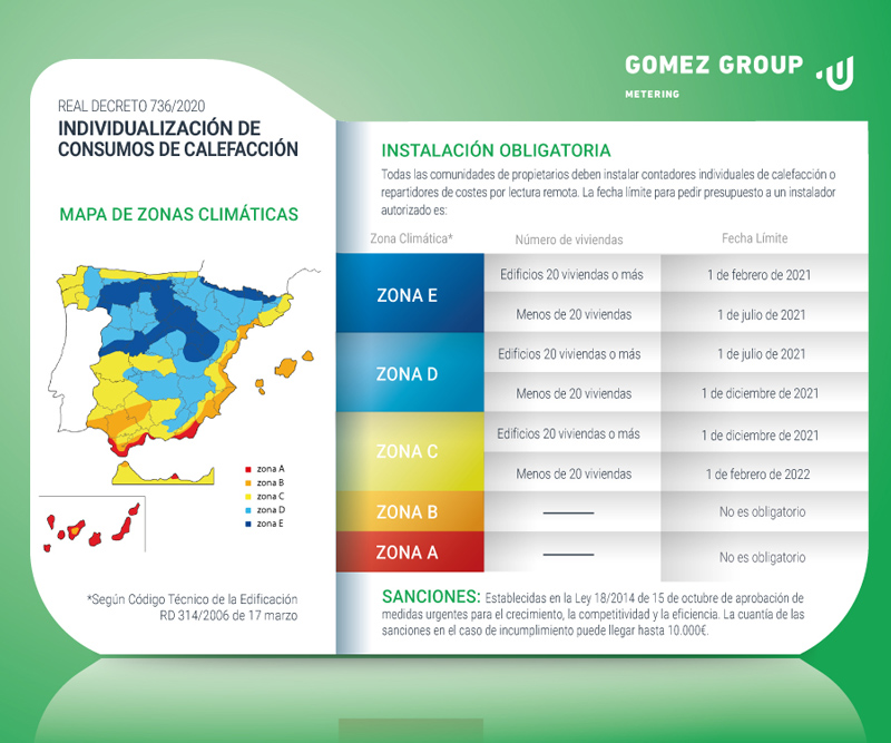 El Gobierno ha establecido una serie de plazos para realizar la instalación de contadores o repartidores de costes de calefacción (en las comunidades con sistema de calefacción en columna) en función de la zona climática. Los edificios con 20 viviendas o más situados en la zona D tienen de plazo hasta el 1 de julio para solicitar un presupuesto a un instalador autorizado. Los edificios con menos de 20 viviendas y los situados en la zona C tienen de plazo hasta el 1 de diciembre. Las zonas climáticas C y D comprenden buena parte de España.