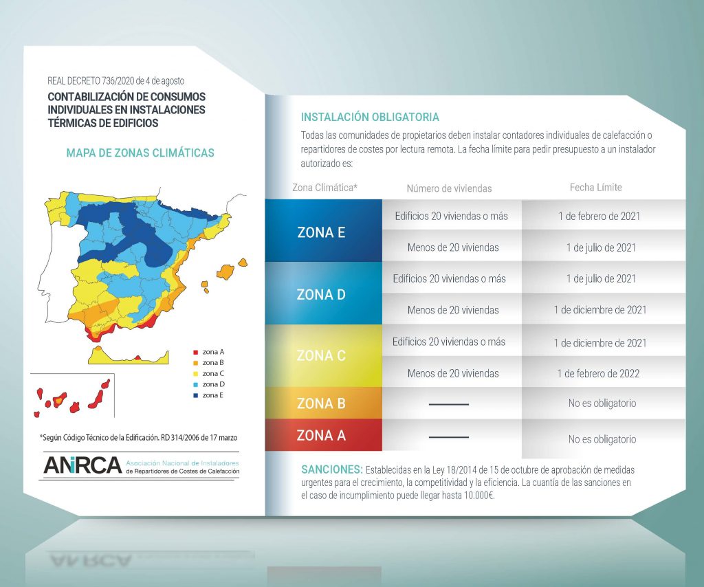 Varía en función de la zona climática en la que se ubica la vivienda. El Real Decreto 736/2020, por el que se regula la contabilización de consumos individuales en instalaciones térmicas de edificios establece unas fechas límite para solicitar presupuesto. Se pueden consultar en el mapa adjunto. A partir de ahí, la comunidad de propietarios dispone de 15 meses para realizar la instalación.
