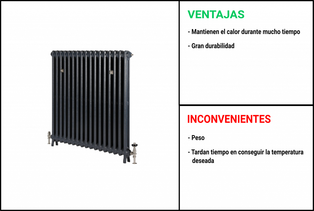 Esto son los radiadores más comunes en los edificios construidos en los años 70 y 80 del pasado siglo. Tienen diferentes cuerpos y un aspecto robusto y pesado.